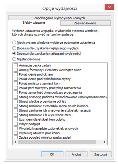 8. Wyłącz w Opcjach wydajności zbędne ustawienia: