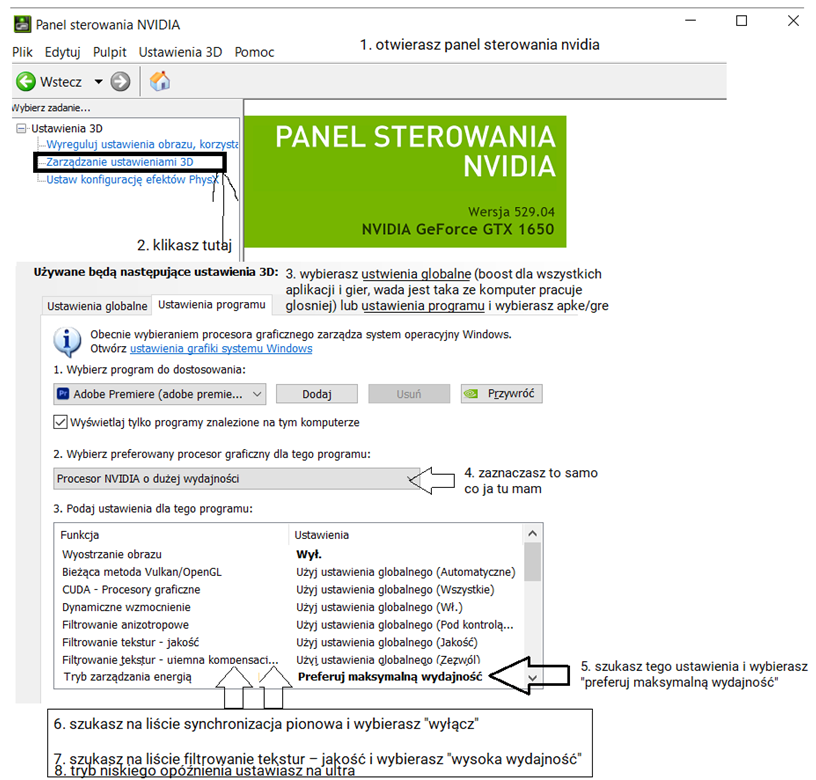 1. Dostosuj ustawienia karty graficznej (NVIDIA) tak, jak na screenie: