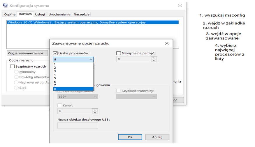 19. Zwiększ liczbę procesorów w narzędziu Konfiguracja systemu:
